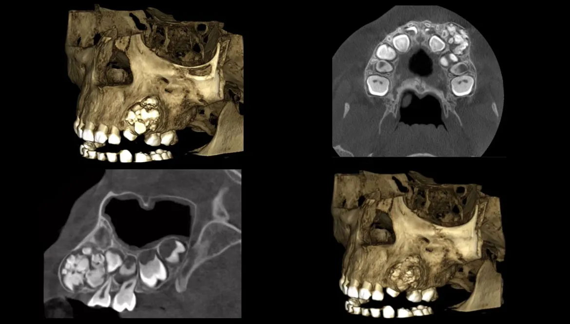 Imagen hiperdensa localizada en el maxilar superior izquierdo, ocasionando el desplazamiento de la tabla ósea bucal y desplazamiento palatino de la pieza 2.4.